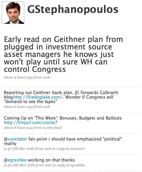 Ditto with George Stephanopoulos' Twitter page. The only tweet that seemed to have any interesting content was mostly incomprehensible. This isn't going to replace a New York Times story: