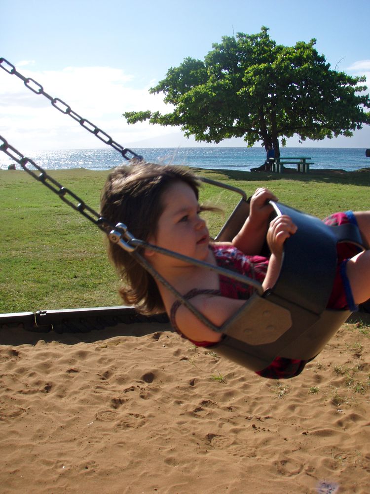 Evelyn swinging at Maui park I'm proud of this photo. Swinging photography is difficult, particularly with a point and shoot camera. Managed to capture Evelyn at the end of an arc. This was a pretty beachfront park, south of Kahana.