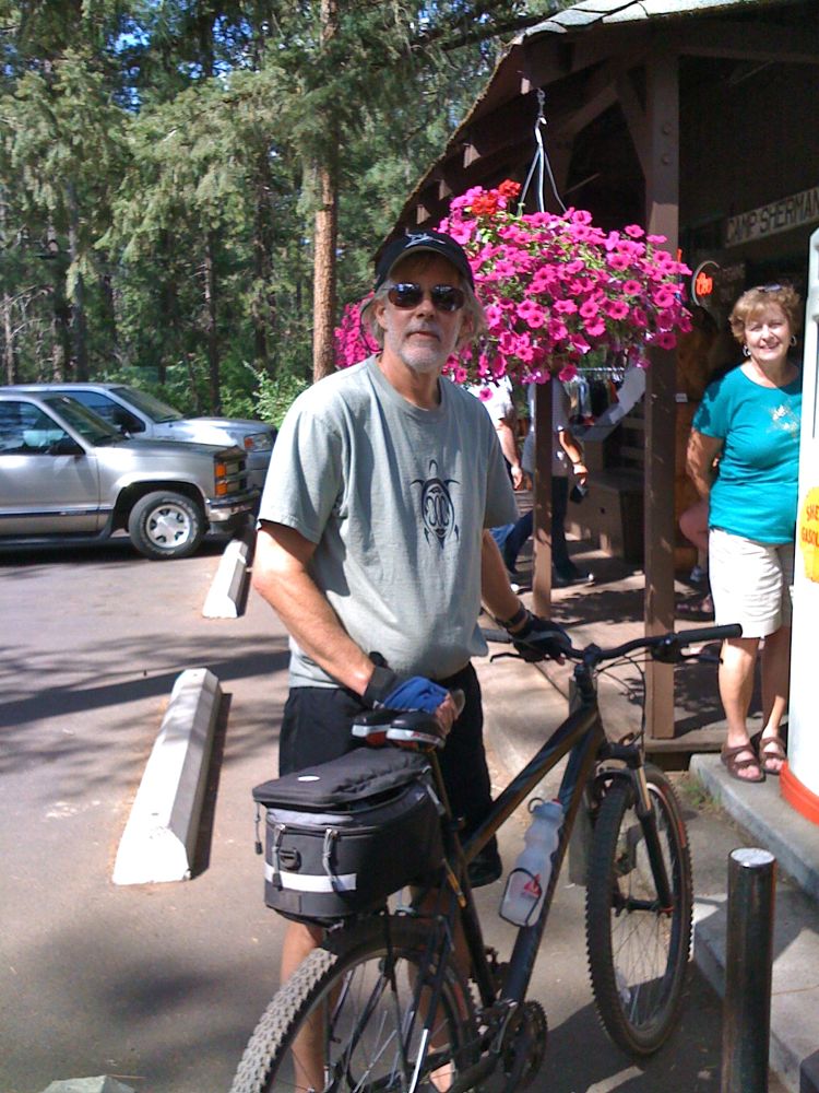 Here I am, arriving at the charming Camp Sherman store after a bike ride. The woman in teal offered to take a photo of both of us after Laurel snapped this shot. Don't think she realized how much she was in this photo. I put my bike in this position to avoid a bunch of people sitting by the store front door. As often happens, my plan went awry.