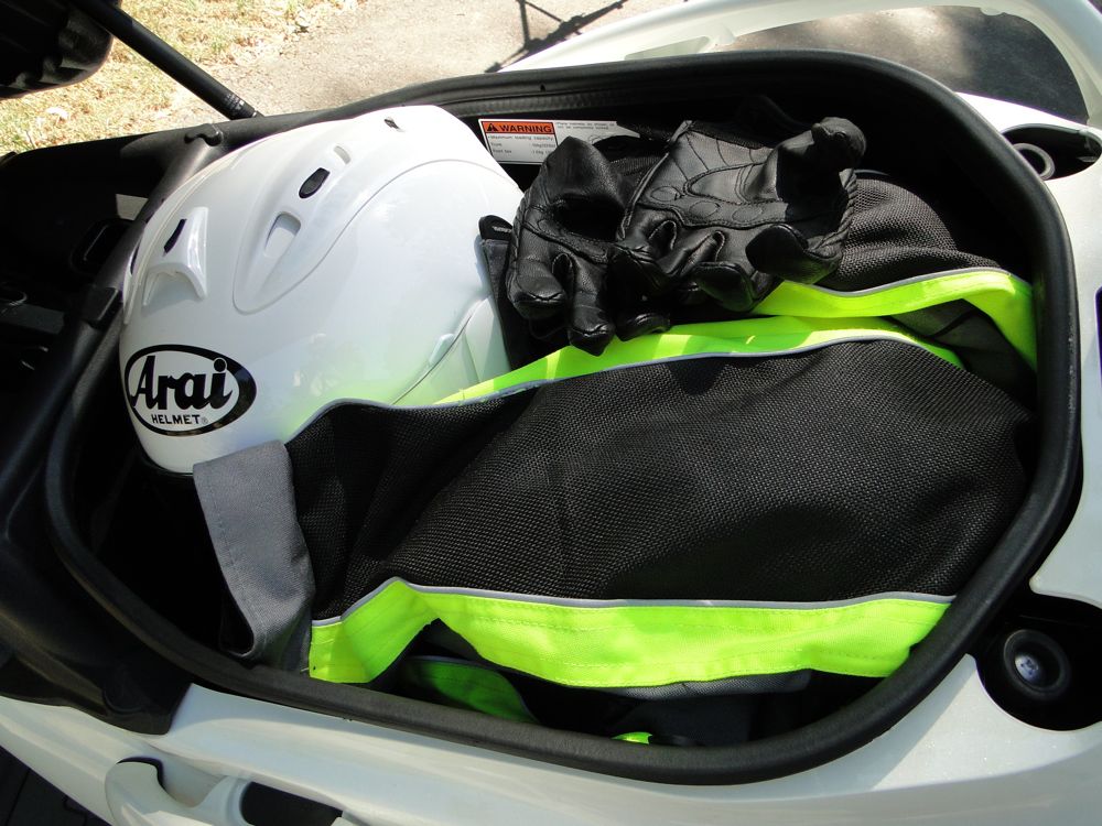 One of the great things about the Burgman 650 is that it has a large storage compartment under the seat. I can put my riding pants, jacket, gloves, and helmet in there, with a bit of room to spare.