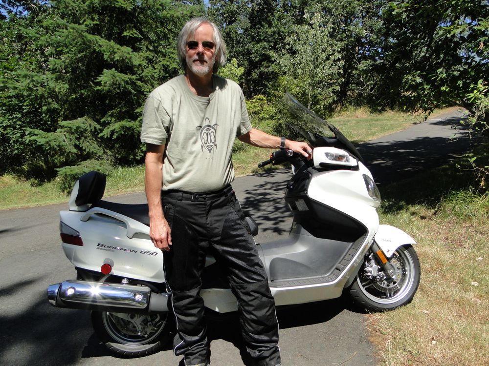 Here I am in my riding glory, prepared to hop on my 2009 Burgman 650 Executive, which now has close to 300 miles on it.