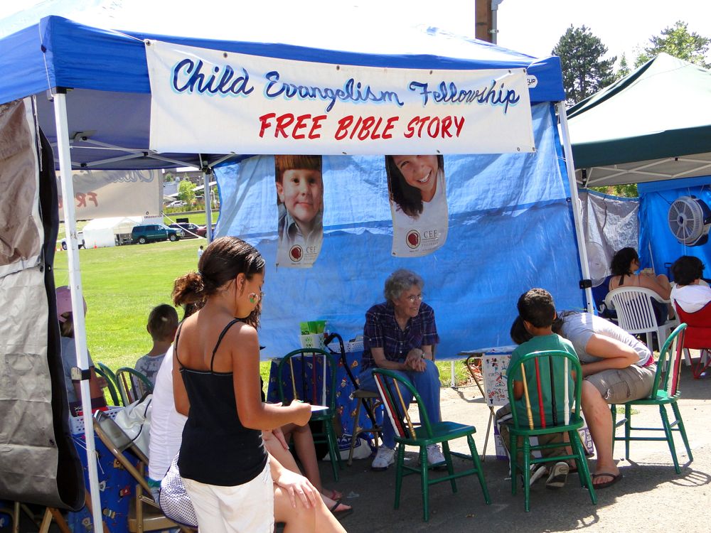 This booth didn't appeal to me, though. Good god! Why would a kid want to listen to a Bible story at a fair? However, they had a decent audience when I walked by.