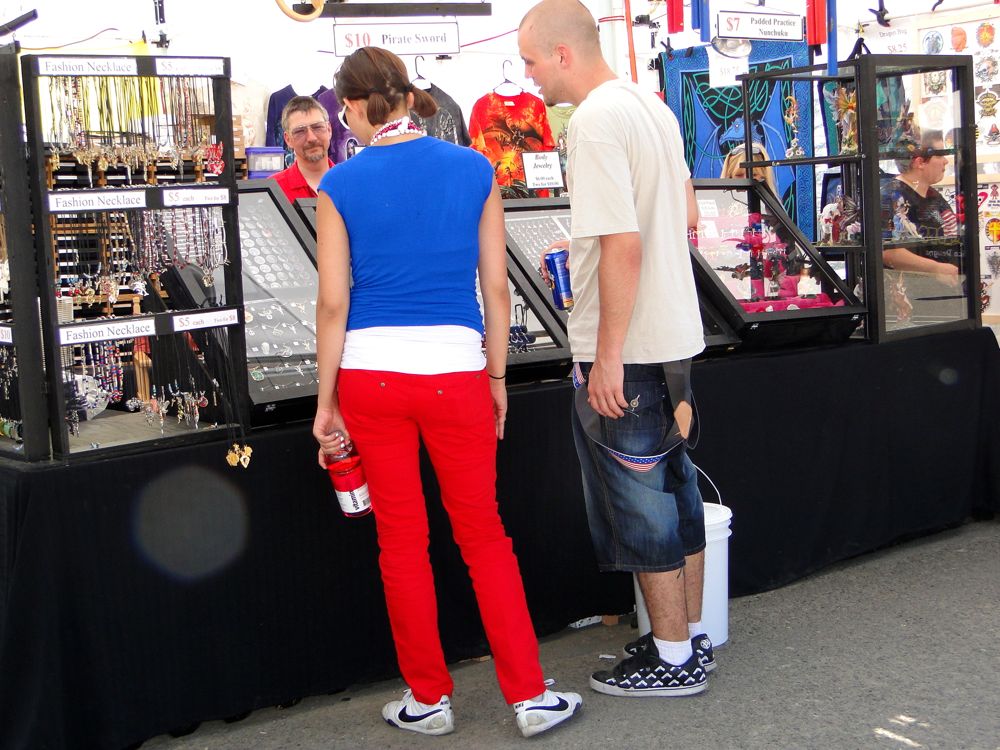 Kudos to this woman on her Fourth of July color coordinated outfit. Including accessories. She needs to get her guy matching better, though.