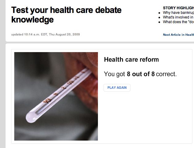 — Nailed it! I wonder how many of the crazies who've been screaming "liar, liar!" at congresspeople who hold health care forums would get eight out of eight correct on a CNN Test Your Health Care Debate Knowledge quiz. I did.