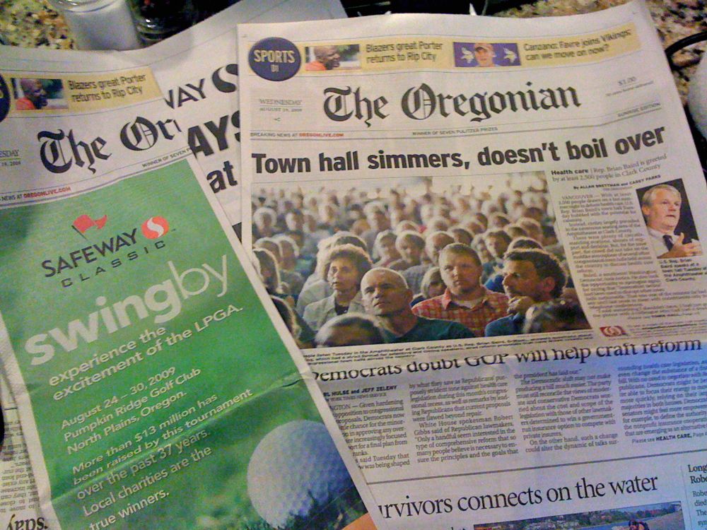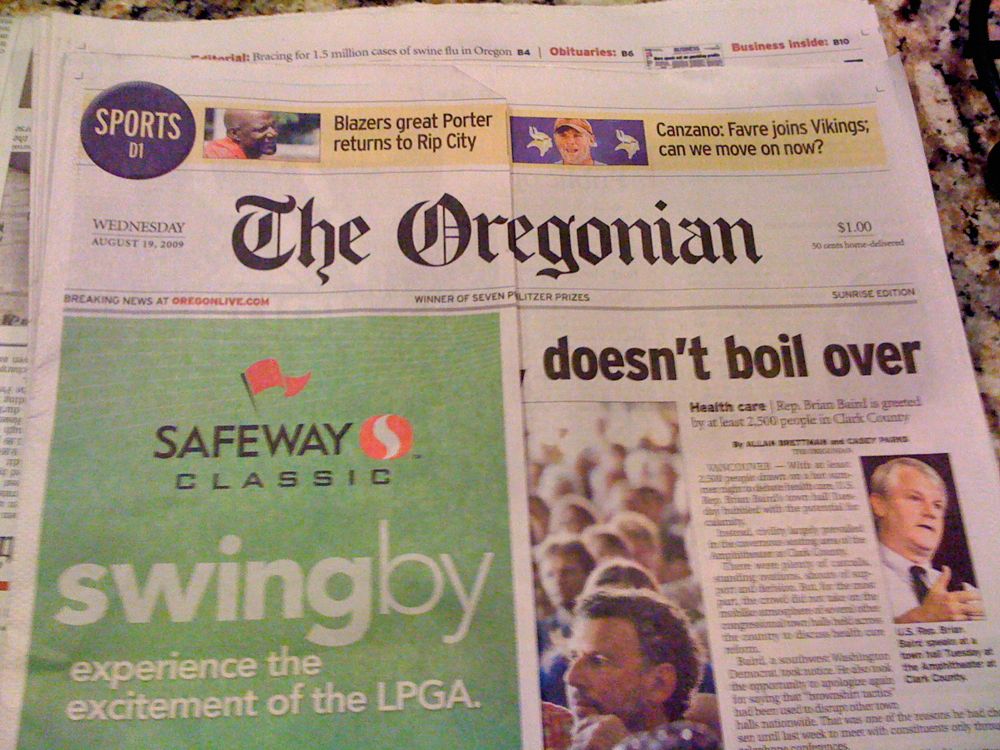I'm holding two newspapers in my hands, the Oregonian and the Salem Statesman Journal. I haven't had a cup of coffee yet, because it's brewing while I get the papers. I don't need to start my day with this goddamn freaking advertising insert covering up half of the front page!