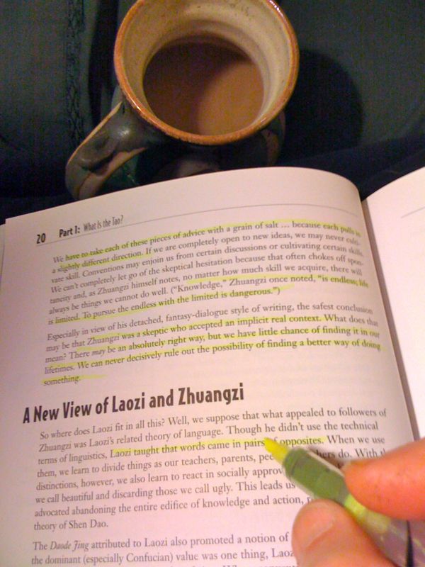 Perhaps I'll never read books on a screen because I'm too hooked on turning paper pages, running a highlighter along printed text, sitting on my meditation cushion with a cup of coffee balanced on the edge of "The Complete Idiot's Guide to Taoism" (good book), feeling the heft of processed wood pulp on my lap.
