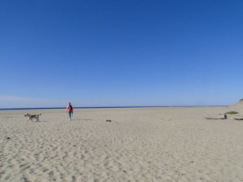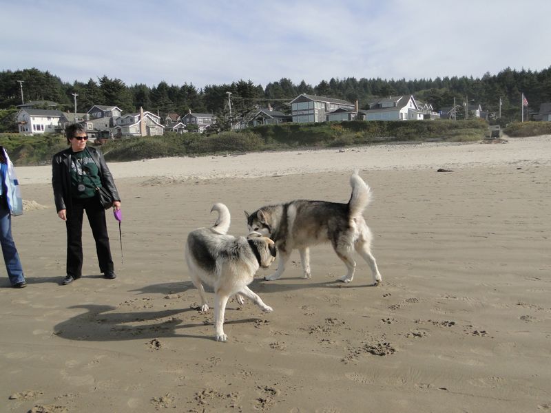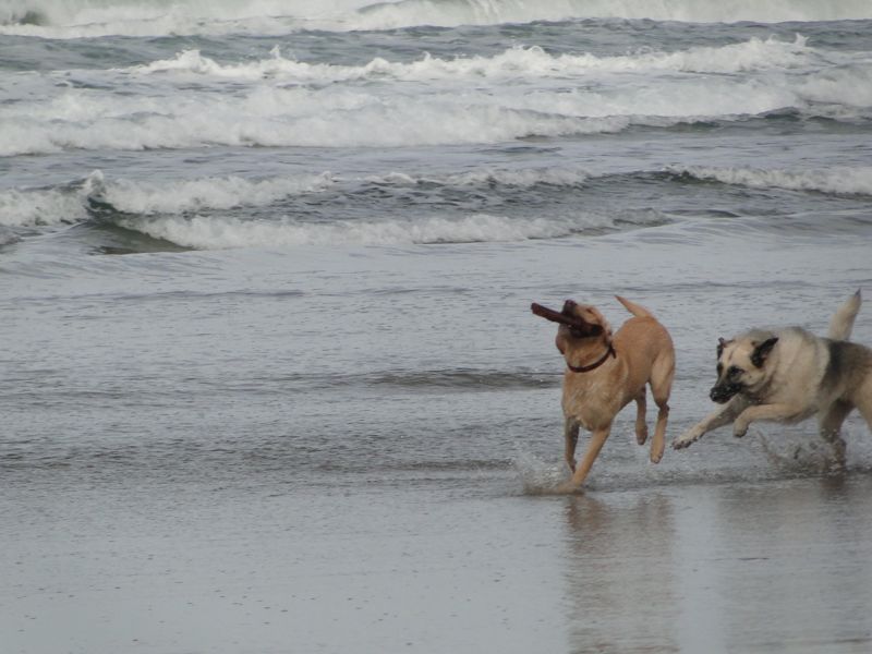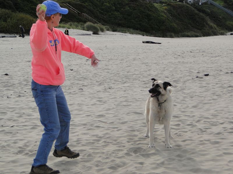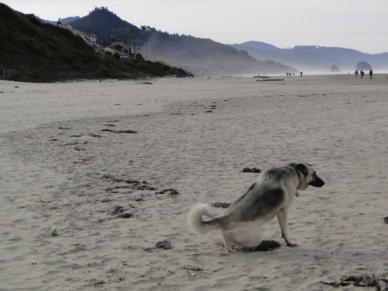 Serena, however, spent much of her ball-throwing time ignoring the ball (unless Laurel bribed her with a treat). Here she is, engaged in a more entertaining activity which she never tires of: making some territory with pee. (Serena hit every abandoned sand castle she came to along the beach; keep this in mind next time you resurrect a used sand castle on the Oregon coast.)