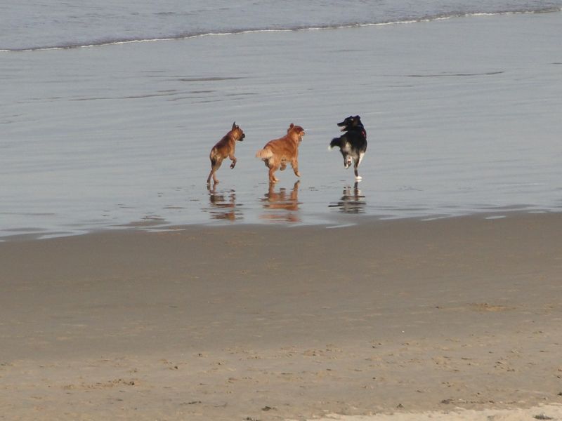 I had a good time taking dogs-on-the-beach photos from our room with the zoom lens zoomed. These three canines had just met up and instantly started a play group.