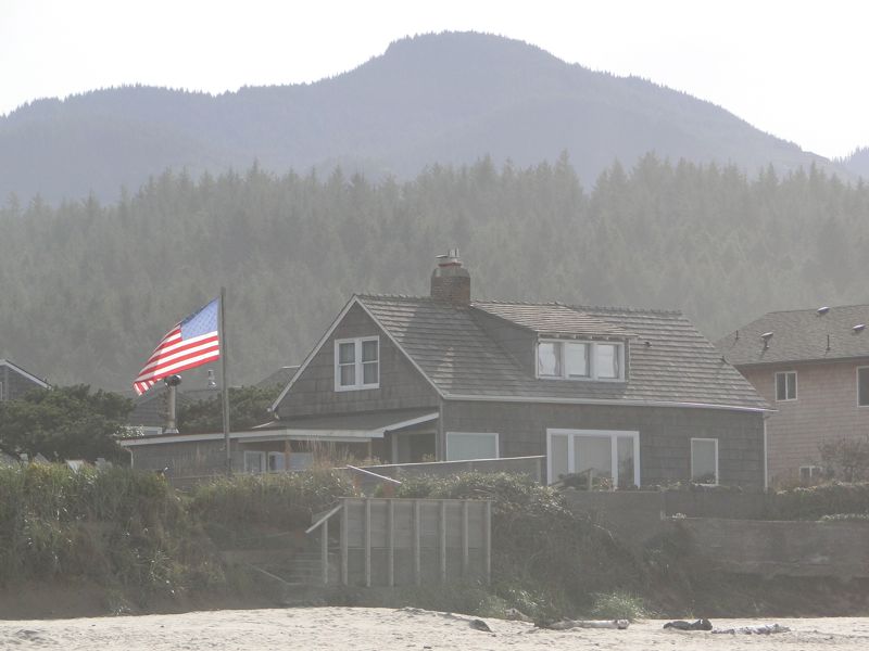 This bright American flag against a misty backdrop of Cannon Beach mountains caught my eye on our beach walk.
