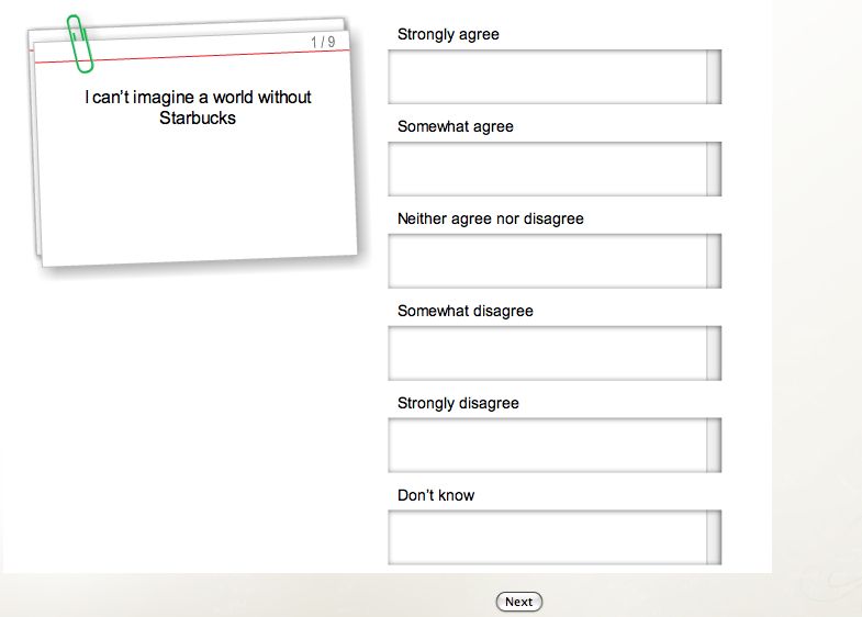 Then I got to a section where I was supposed to share my feelings about Starbucks itself, responding to statements such as "I would defend Starbucks against attacks" on a strongly agree to strongly disagree scale.
