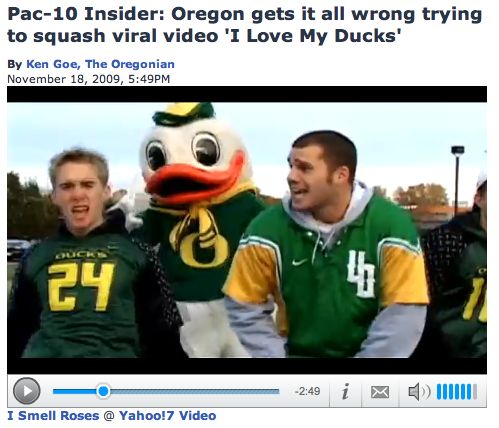 Goe tells the sad story of how this video got squashed because — horror of horrors! — the Oregon Duck mascot appears briefly in various scenes.