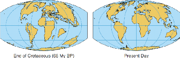 FIGURE 19. Continental locations 65 million years ago and today. The Cretaceous era ended and the Cenozoic began 65 million years ago. (Data from Hansen et al., "Target Atmospheric CO2," (see sources) based on original data from Ron Blakey at Northern Arizona University.)