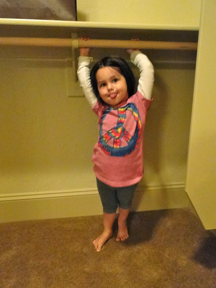 Next day I thought it'd be fun to take Evelyn to a few expensive houses featured on the Salem Tour of Homes. If was a builder, I know I'd just love to have little kids running around the brand new fancy house that I'm trying to sell. Evelyn proved that this closet bar is strong enough to hold lots of clothes.