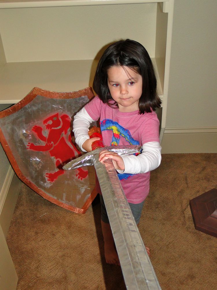 One Tour of Homes bedroom was decorated in a child fantasy fashion. Naturally I had to see if Evelyn could channel her inner Knight. Absolutely. (Don't worry about the camera angle; most of my vital organs are still functioning.)