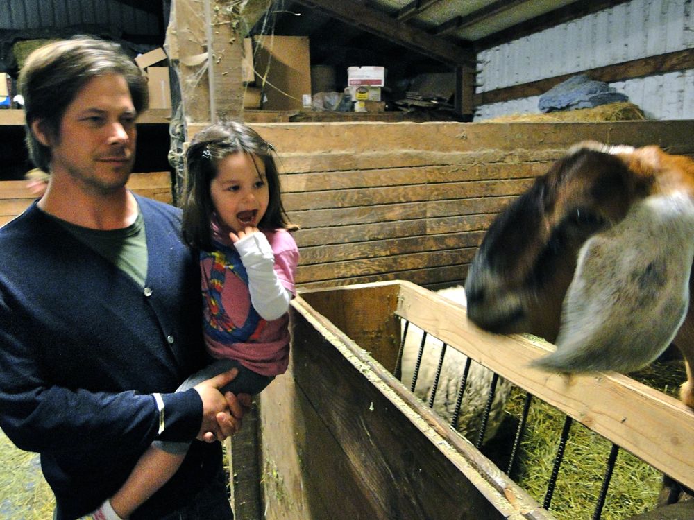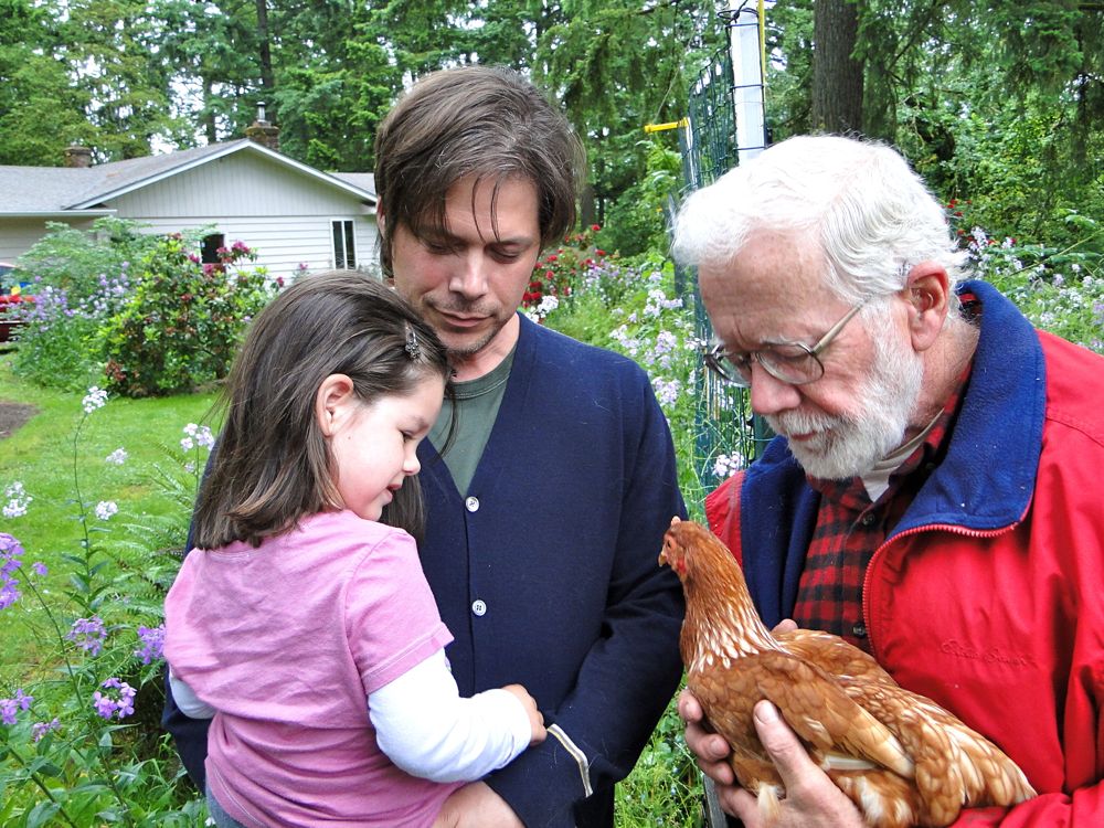 Another day, it was off to Russ and Delana Beaton's charming homestead in far rural east Salem. Here Russ is showing one of the flock to an uncertain Evelyn while Dad (Patrick) holds her.