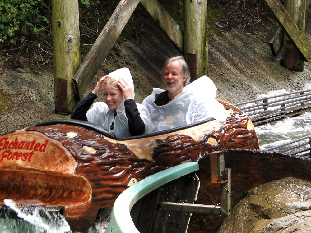 Ah, one photo with no Evelyn. Celeste and Patrick held my camera while Laurel and I went on the log ride. Cool day that it was, we weenied out and put on optional plastic coverings. You can see that Laurel was concerned about getting her hair wet a lot more than I was. The last drop was scary, but we 60-somethings made it through just fine (and barely damp).