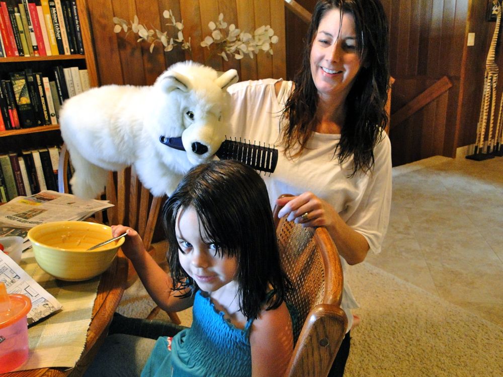 I enjoyed being reminded of the Tricks Parents Play. Evelyn wasn't wild about having her wet hair combed by her mom, so Celeste had Wolfie the White Wolf do it instead.(Laurel still has some of the puppets she used when she did child counseling.)