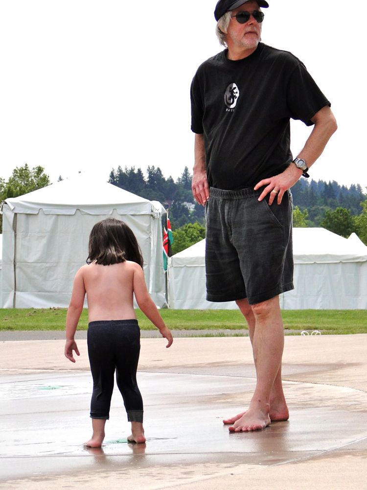 Then it was off to the Riverfront splash pool. I was pleased to read on the rules board that kids Evelyn's age had to be accompanied by an adult. That day the water features functioned irritatingly intermittently, so most of the time I was looking around (along with Evelyn), muttering "Where's the water… where's the water."