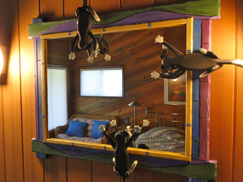 Laurel instantly fell in love with this Laffing Stock piece, which features three dogs clinging to the mirror frame and looking at themselves. It adds some welcome whimsical color to our woody extra bedroom.