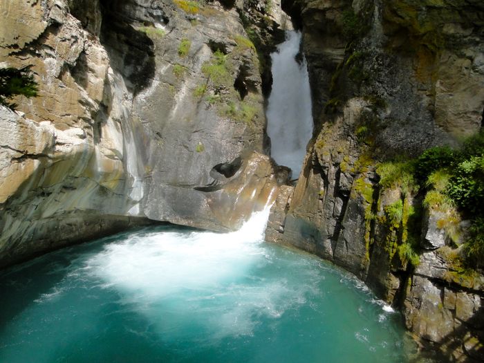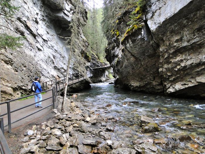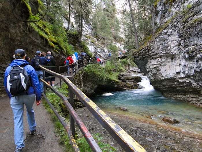 Much of the 1.7 mile hike (one way) is along walkways that have been built along the stony sides of the canyon. Impressive construction feat. In grizzly bear country you're supposed to walk in groups of four. On this hike we often were in groups of dozens.