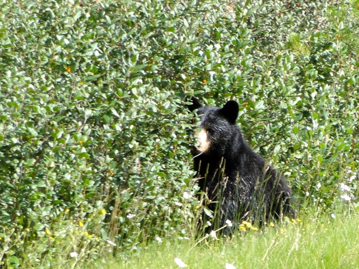 Suddenly she yelled, "I think I saw one!" I made a quick u-turn and stopped. Yes, there was a black bear eating berries (we assume) just a little ways off the road. A passing bicyclist and a large truck scared the bear off before we could get a better shot than this.