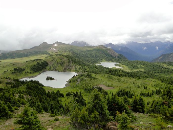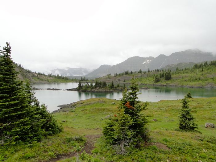 This was taken from the Standish viewpoint, looking down on Rock Isle Lake and Laryx Lake. My heart and lungs asked, "how #$%!&! high have you made us climb?" I fired up Motion X's GPS iPhone app. Answer: we were at about 7,800 feet, while the spot where the bus left us off is at 7,150 feet. The weather was cool and drizzly, or my heart and lungs would have been complaining even more.