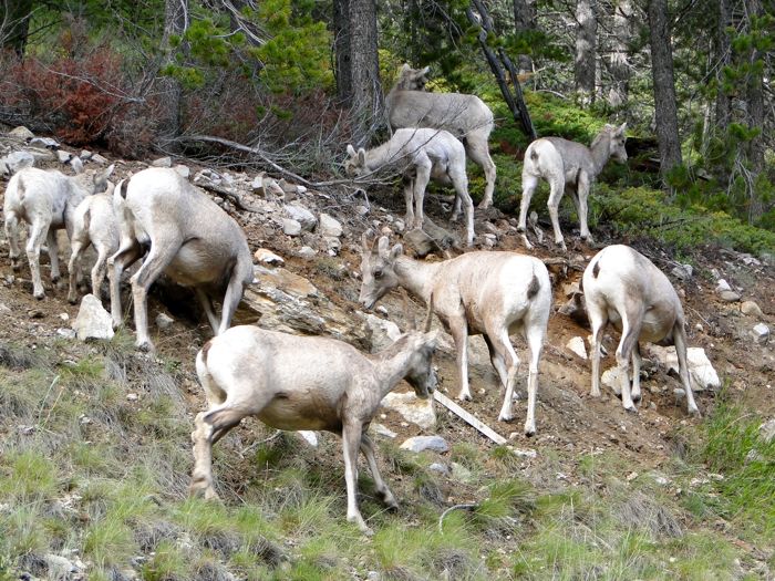 Naturally, soon after we got in our car and started to drive back to Banff, we saw a large herd of mountain goats browsing by the side of the road. Unscarable, I drove up next to them and took some photos from the car window.