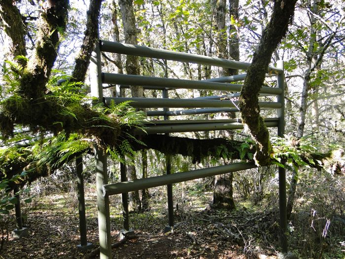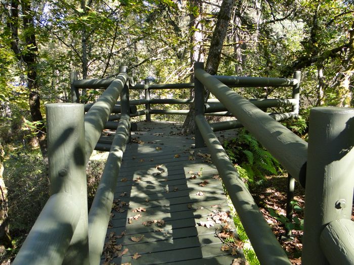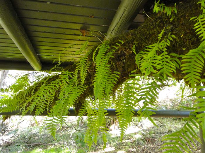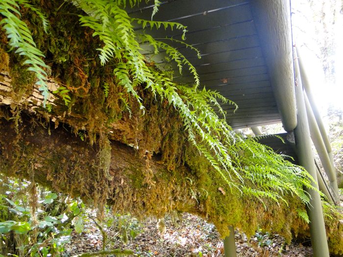 The deck boards curve around a protruding fern-strewn trunk, since we must blend with nature's ways.