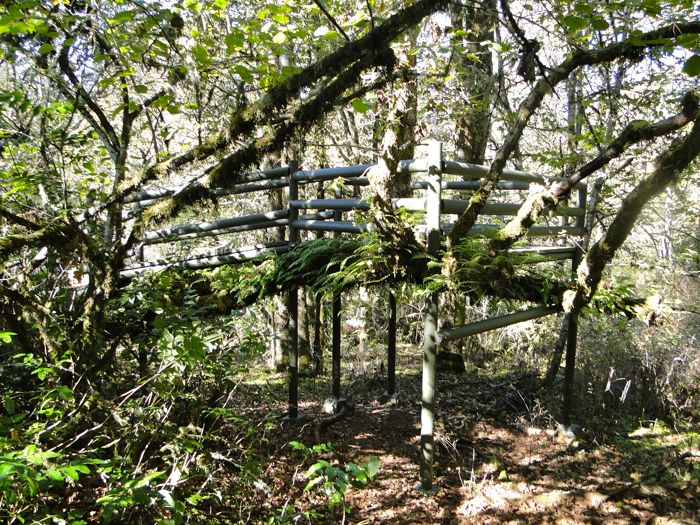 I liked the idea of round supports and railings — much more natural looking than rectangular boards, since trees are round, not square. We also agreed that getting up to the tree house should be along a board path that followed the sloping trunk of the leaned-over tree which called to me one day: "I should be a tree house!"