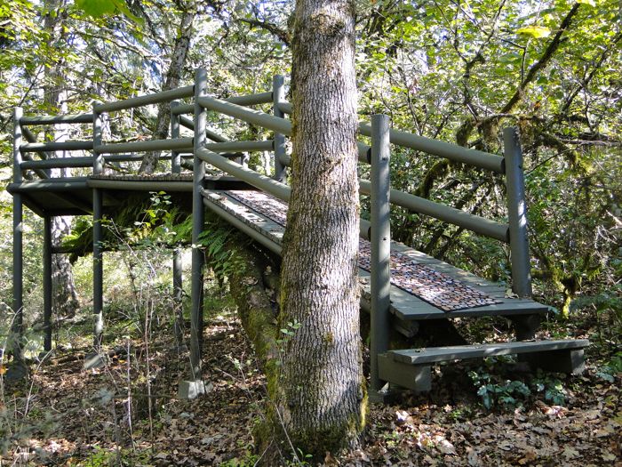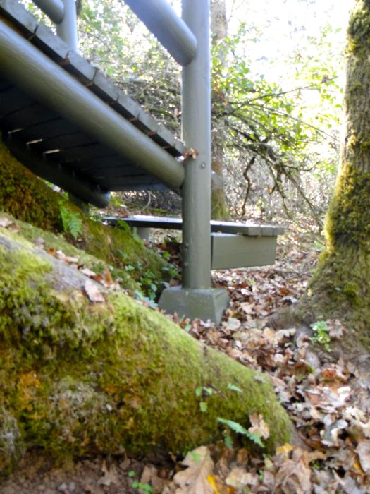 I like how the tree is continuing to grow from beneath the bottom step. My artistic vision always was to have a walkway parallel the slope of the trunk, so visitors would have a "tree-climbing" experience. This is another example of how artists are not understood by those lacking their sensitivity, since my wife would say, "Why not just have a ladder going up to the platform?" (I assume she also would have told Michelangelo to draw stick figures so as to make his work simpler.)