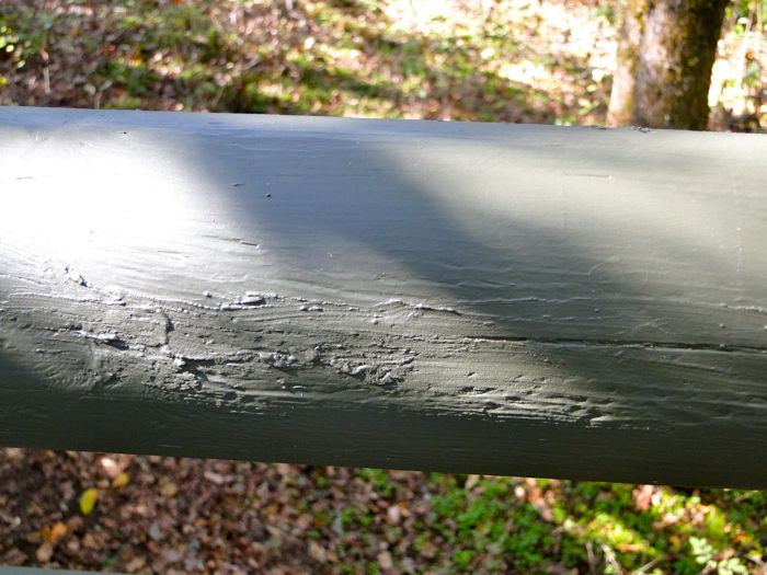 I smoothed on the crack filler with a gloved finger, rather than a putty knife. This left bumps and ridges that often are indistinguishable from natural irregularities in the lumber. Where a lesser mind would see poor construction work, an elevated vision like mine recognizes… artistry.