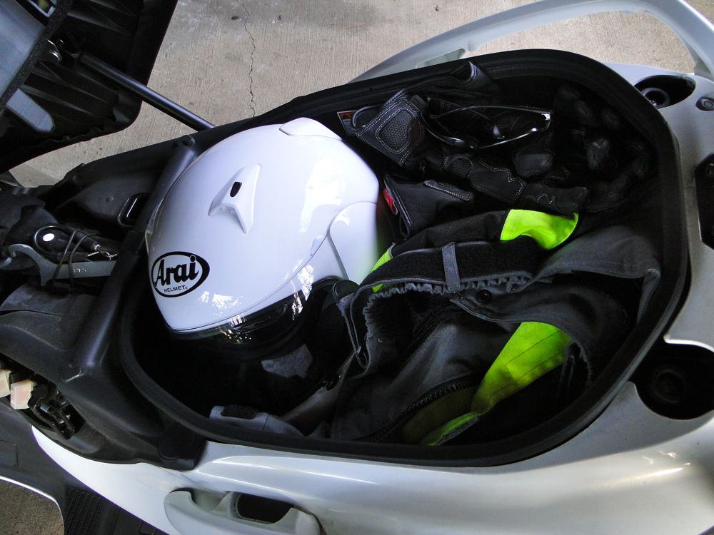 The underseat storage is great. I can easily store my helmet and jacket, plus gloves and dark glasses, when I make a stop. No need to carry all your gear around in stores, or wherever. I've found that I can even cram my helmet, protective jacket/pants/gloves, and boots under the seat. So I can head off in shorts and sandals during the summer, then come back and gear up without needing to carry anything around.