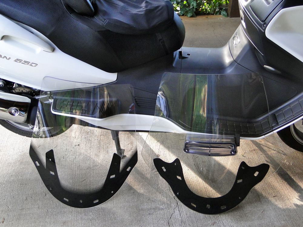 l've got an XL Clearview shield on the Burgman, as I wanted less wind noise/buffeting (the screen is clear and has a vent). However, I still have the stock shield, on the left in the photo above, and a Large Clearview (tinted and with a vent) that I used for a while until I decided an XL was better for my six-foot body.