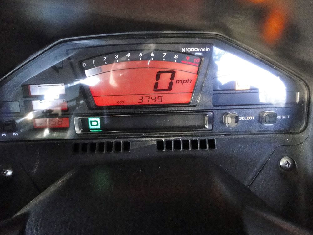 This is the instrument panel, showing the mileage as of today. I like the high-tech look. If you want a retro, chromed-up bike that can be heard coming from blocks away, get a Harley. But if you want super-fun, reliable, safe, stylish, 44 mpg transportation, get a Suzuki Burgman.