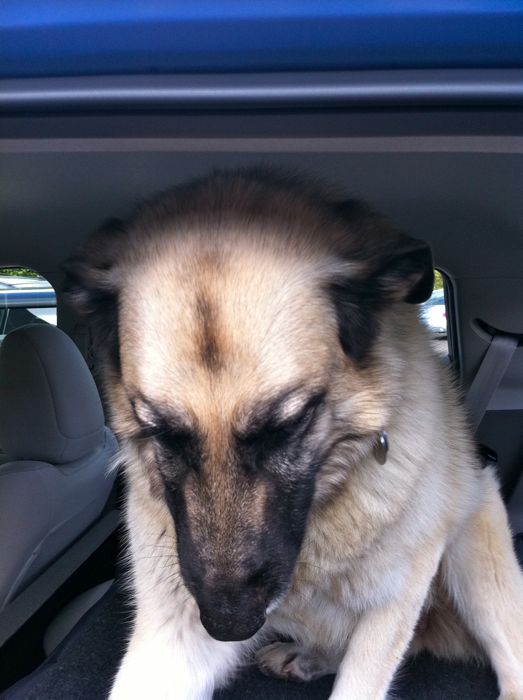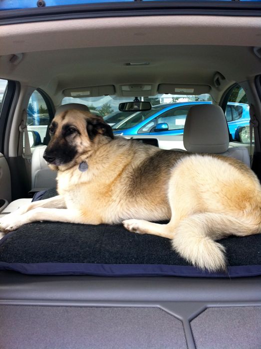 The first things I learned were (1) Serena was happy to settle down in the car, (2) So happy, I had no chance of taking a photo with my iPhone while she was still standing up after I'd lifted her into the rear compartment.