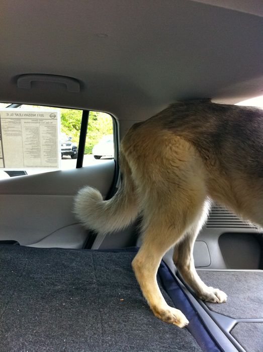 "Stand, Serena, stand!" had zero effect. Pulling her up by the collar worked better. However by the time I dashed around to a door and snapped a photo, all I caught was a dog butt at the (appropriately) rear end of the cargo area.