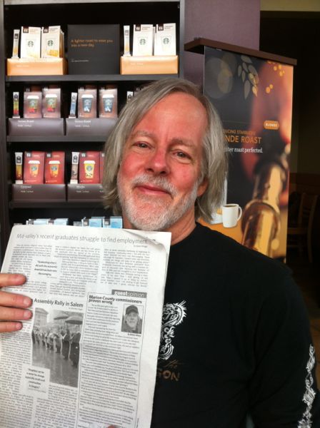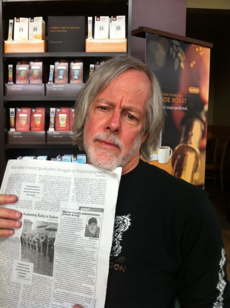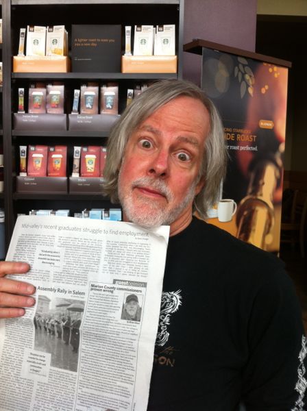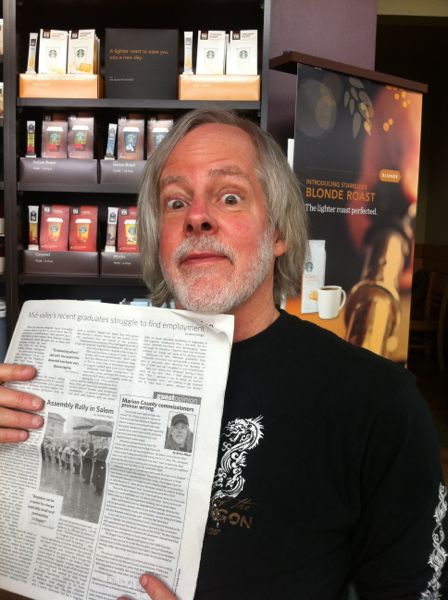 He also wanted to see how well the iPhone 4 camera works. So I handed over my phone and posed with the Salem Weekly for several photos, visualizing how Jean Dujardin would handle a photo shoot.