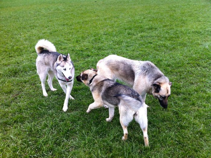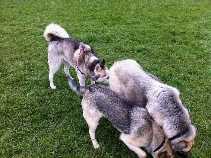 An attractive Husky mix wandered over to sniff our "pack," who were deeply enthralled with their own smell feast.