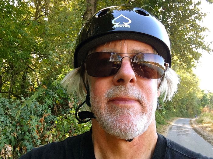 Here I am, timer-photo'd with my iPhone propped against my backpack, standing in the shadows on a sunny October Oregon day, on the Minto Brown Park trail which runs along the Willamette River (in the background) near Salem.