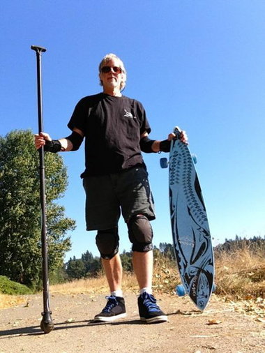 …Feedback: He says of paddling his longboard: "I'm hugely impressed with the great exercise this is. It's aerobic and a tremendous core workout. Having done this regularly for a month or so, I can say that I've never felt in better shape. Emotionally and psychologically it suits me very well. There's just enough risk to keep my attention focused but not so much as to cause anxiety. I wear knee and elbow pads, padded shorts, hand guards and a helmet." Hines says he has none of the aches and pains that many people in their 60s complain of. He believes if you do what you love you don't get as tired. "It's like being 10 years old again; just you and a pole pushing yourself along. It uses every part of your body."