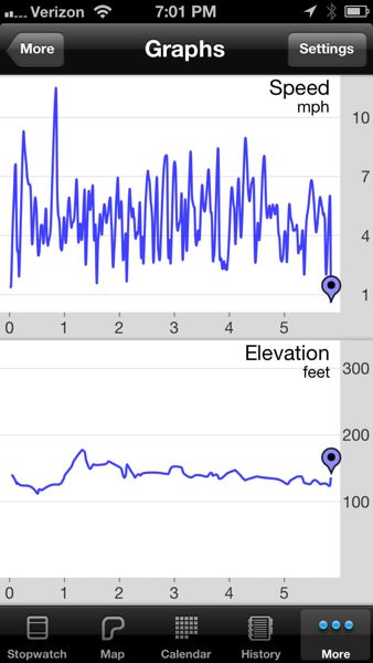 Here's the Runmeter graph of speed and elevation change. You can see that when I'm moving, my land paddling speed ranges between 2 mph (or less) on uphills and a sizzling 12 mph on a brief downhill run. The elevation change graph shows about 65 feet of up- and down-ness on the trails I take. I start out on a fairly steady uphill stretch, which then becomes fairly level and downhill'ish after a bit over a mile.