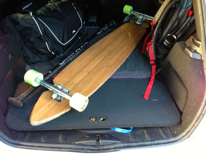On the slight chance that a prospective buyer of the Kalai reads this who, like me, has a Mini Cooper, here's proof that it fits in the back. Just barely. I carry the Kalai around almost all the time, along with my protective gear bag, the backpack that I wear while land paddling, and the adjustable Big Stick.