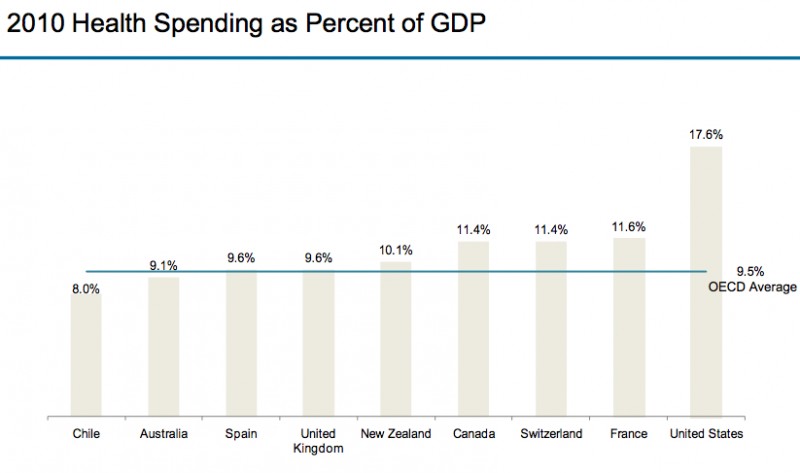 Here's a graph that shows how much more of our GDP goes to health care than, say, in Canada or the United Kingdom.