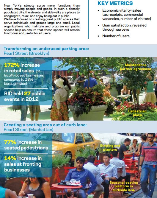 Tumlin used a slide from New York City to show how removing curb lanes and/or parking stalls to create more walking space – and tighter carspace – can dramatically increase retail activity.