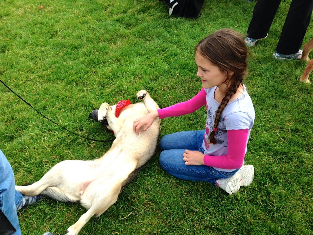 Zu Zu made lots of friends, friendly dog that she is. Some passers-by were impressed that she was relaxed enough at the Mutt Strut event to collapse into her favorite patting pose when this girl asked if she could pat Zu Zu. Could she?! It was a must!