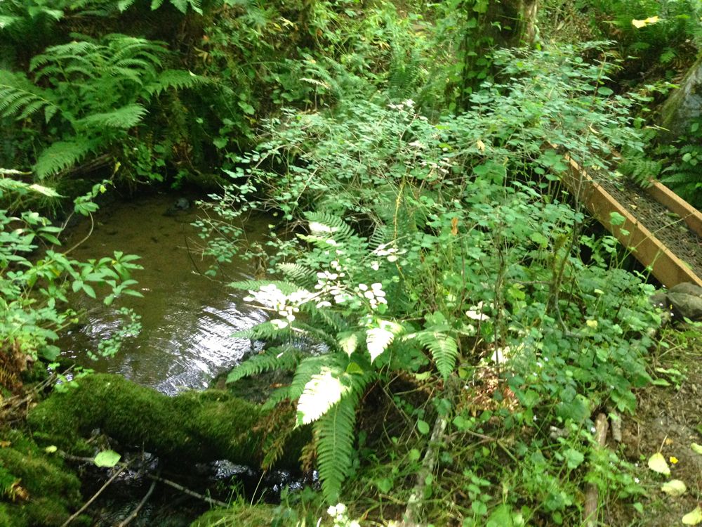 We're starting to think about where we may want to live if (or more likely, when) our non-easy care house on ten rural acres in south Salem gets to be too much of a hassle to maintain for us senior citizens. Walking across the creek this afternoon made me realize — as if I didn't already know this — how difficult it would be to leave our property behind. The photo doesn't do justice to the small creek, filled with ferns and greenery, which tumbles over a few small "waterfalls" in this area on its way to Spring Lake.
