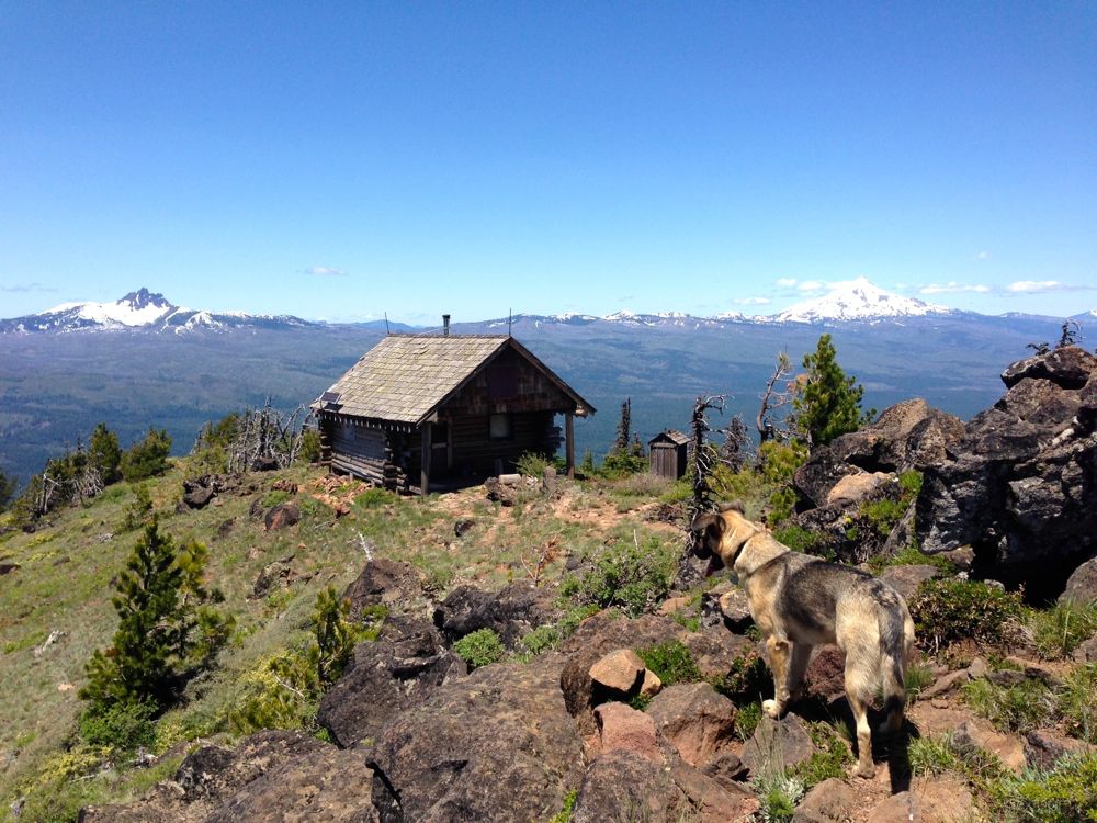 Hiking to the top of Black Butte, an ancient volcanic cone that sits near the headwaters of the Metolius. The view is magnificent. Zu Zu, our dog, is doing her best wild coyote imitation. I love the old cabin. Home at one time for those who manned/womaned the fire lookout, I believe.