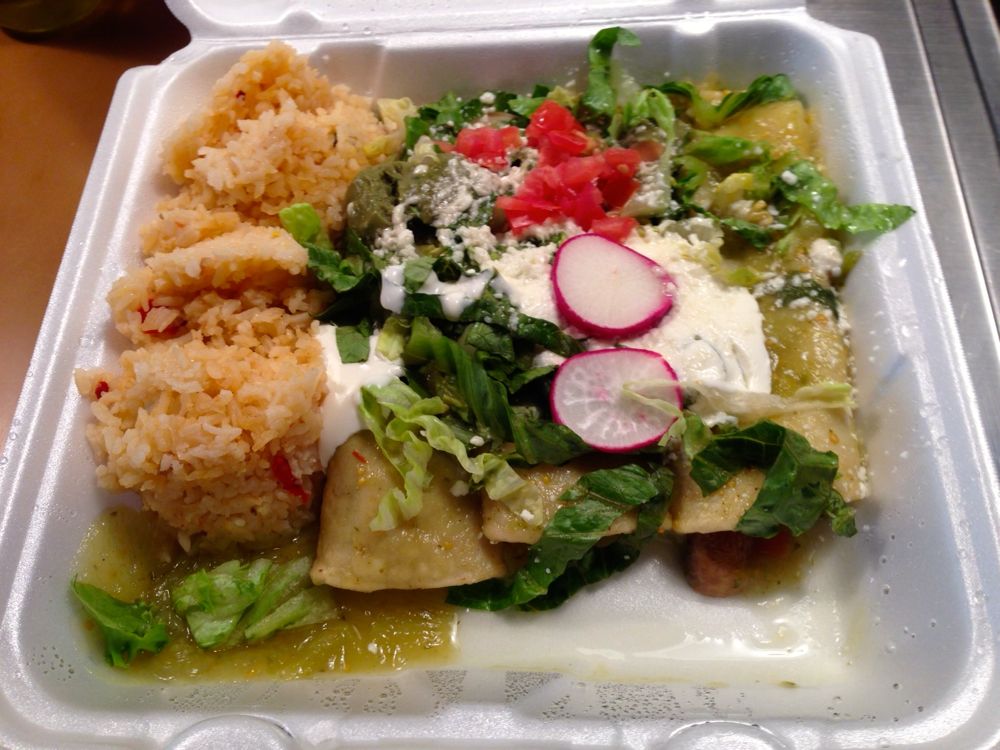 A vegetarian delight – Three corn tortillas cooked in a light cream sauce, served with fresh spinach sautéed with tomatoes, onions, and mushrooms in a creamy green tomatillo sauce. 14