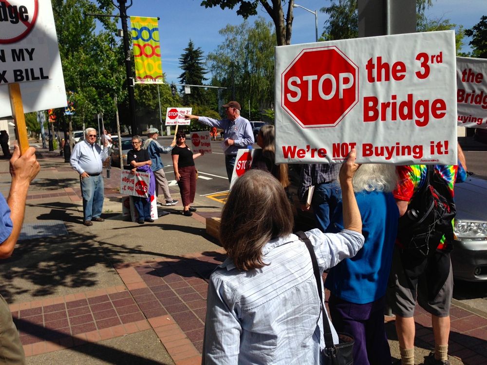 I took part in a No 3rd Bridge rally down at Courthouse Square, where the bridge proponents were holding an open house in an attempt to sell people on this $450 million unwanted, unneeded, and unpaid-for boondoggle. Jim Scheppke, standing on a "soapbox" and pointing, ably organized the protest. I blogged some about it here.
