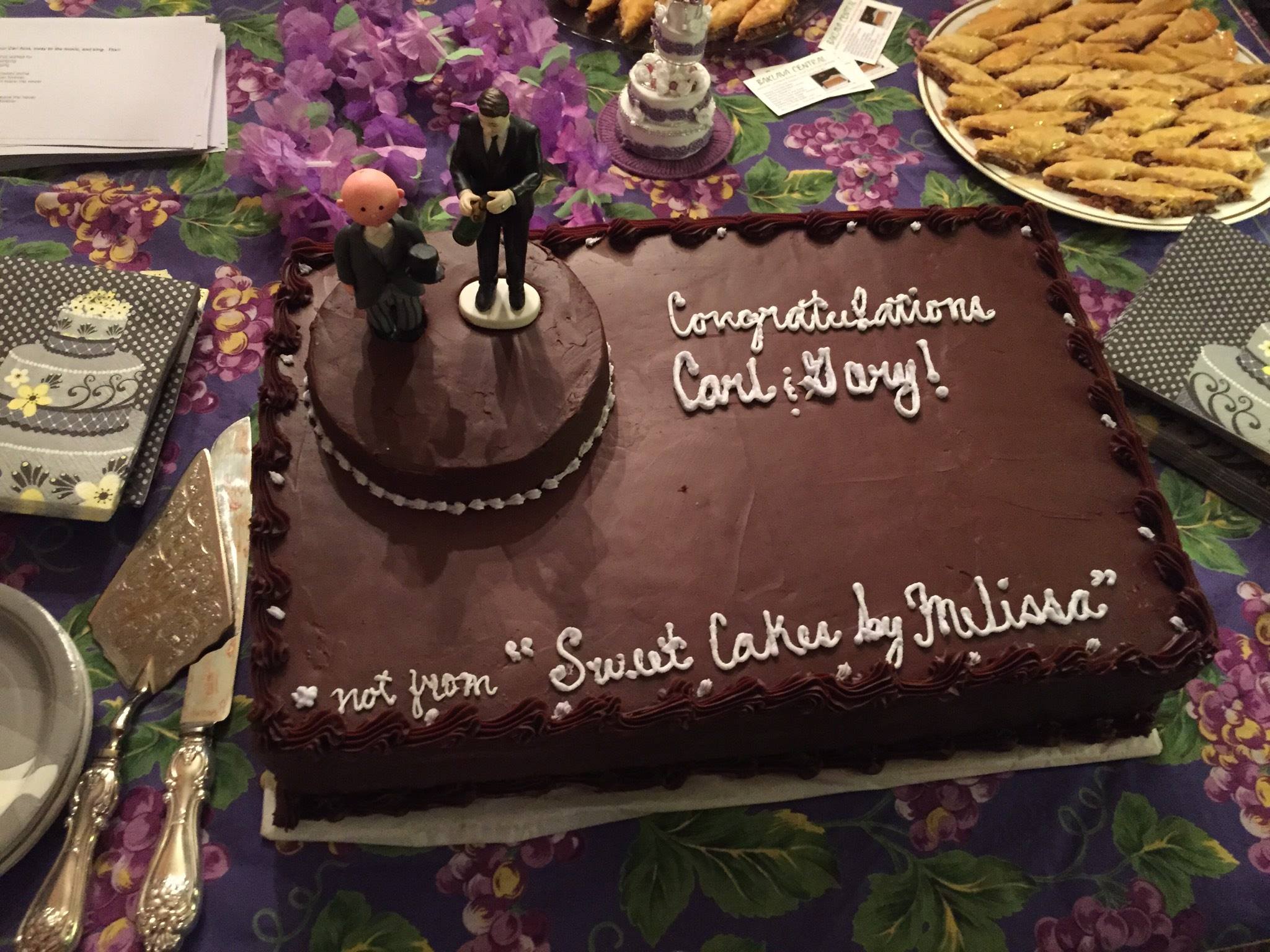 Another high point for me was when the sixty or so guests gathered around the food table where a pre-wedding cake in honor of Carl and Gary awaited cutting/eating. The "not from 'Sweet Cakes by Melissa'" reference refers to the Gresham bakery that famously refused to sell a wedding cake to lesbians.